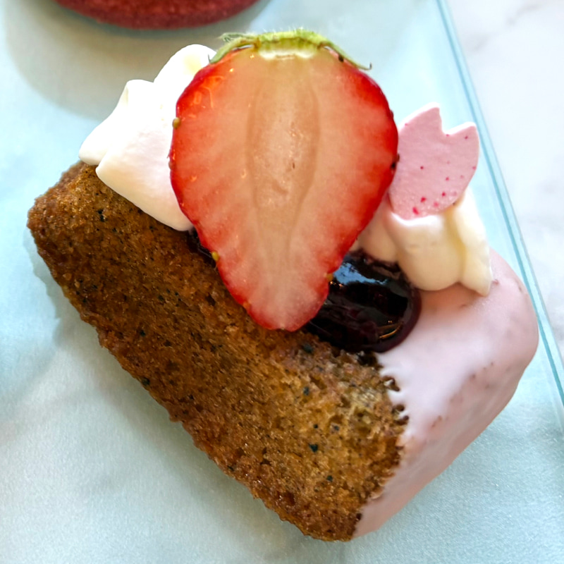 ピンクのチョコレートが鮮やかな「紅茶とクランベリーのパウンドケーキ」。アールグレイ香るしっとりした生地に酸味の効いたクランベリージャムを添え、いちごとホイップクリームをのせた一品で、華やかさとクラシックさのバランスが絶妙。パウンドケーキに、紅茶の香りが入ることで、上品なアクセントになっています。