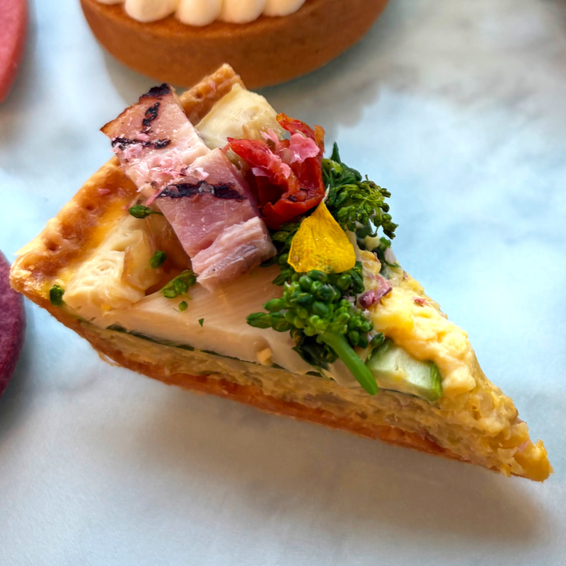 春の季節感をしっかり拾っているのが「桜ベーコンと春野菜のキッシュ」。桜の葉で香りづけした自家製のベーコンをアクセントに、たけのこや菜の花を合わせた具だくさんのキッシュで、心地よい苦味が味に奥行きを与えてくれています。スイーツの合間にこの〝ほろ苦さ〟が入ると、アフタヌーンティー全体のリズムが良くなります。「春らしさ」を香りと食感の両方で感じられるセイボリー。
