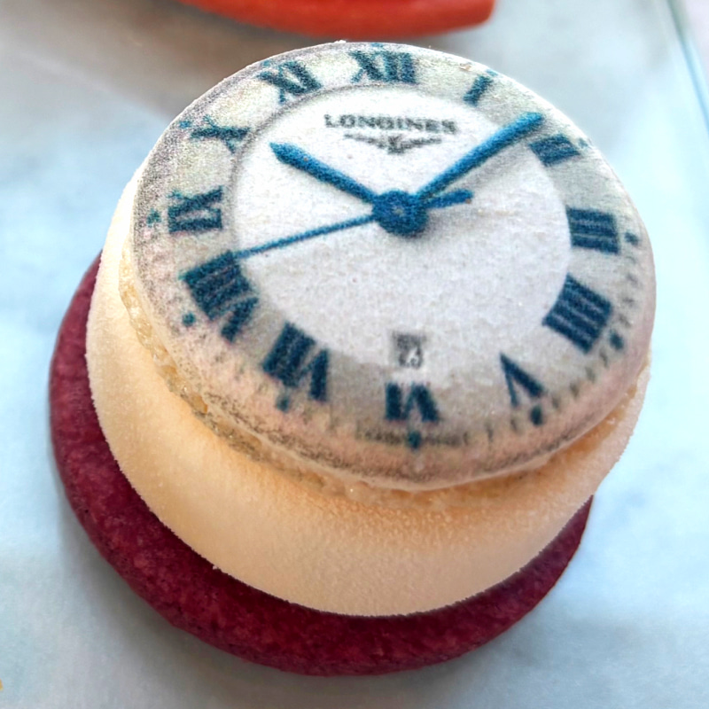 「いちごとラズベリーのムース」は、ベリー尽くしのスイーツ。しなやかなシルエットで、時計の針を表現。鮮やかな赤とピンクが目を引きます。口どけなめらかないちごのムースでラズベリージュレを包み、土台にはいちごサブレが。甘さの中にすっきりとした酸味があるタイプなので、見た目以上に〝軽やか〟に食べ進められます。時計の針というモチーフの選び方も、ロンジンらしい繊細さが出ています。