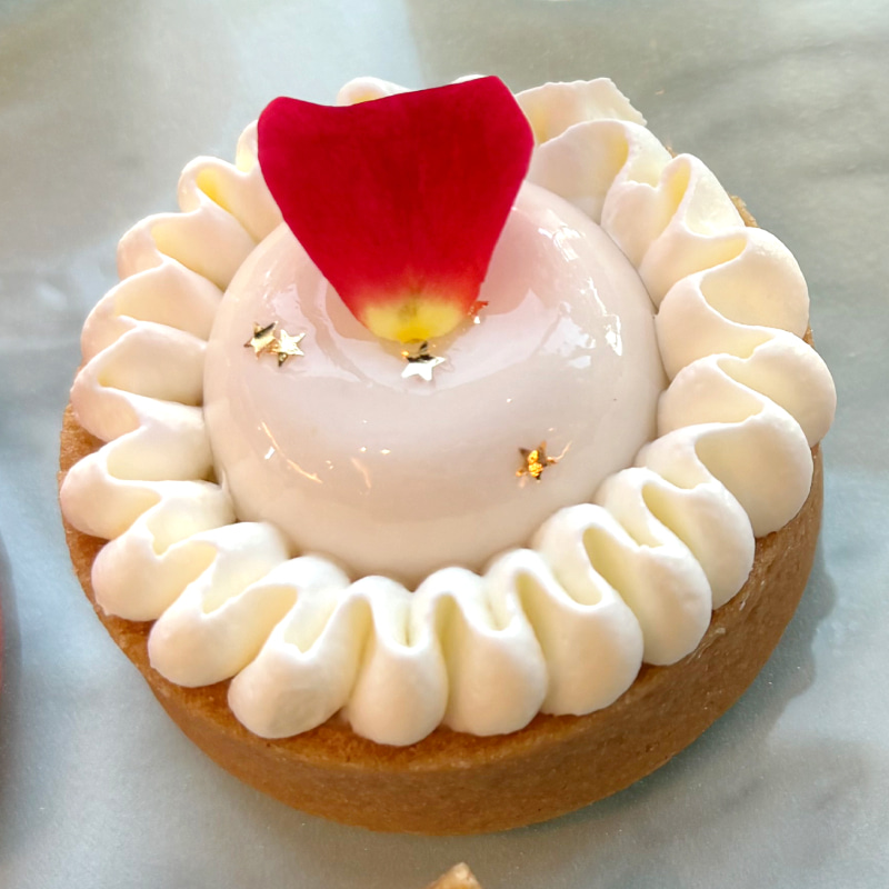 コクのある余韻が印象的な「いちごとトンカ豆ガナッシュのタルト リコッタチーズムース」。タルト生地の上に、いちごジャム、アーモンド生地、トンカ豆のガナッシュを重ね、さらにリコッタチーズのムースと生クリームをトッピングしたリッチな多層構造。しっかりとした甘さが口の中に広がる設計で、かわいい見た目に対して味わいはかなり立体的です。