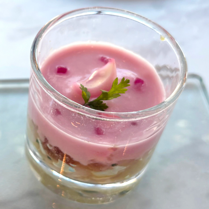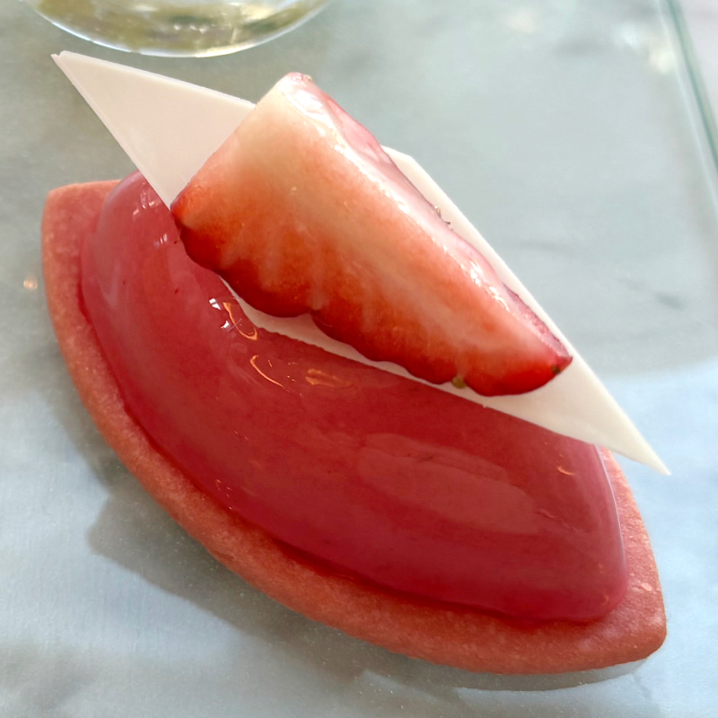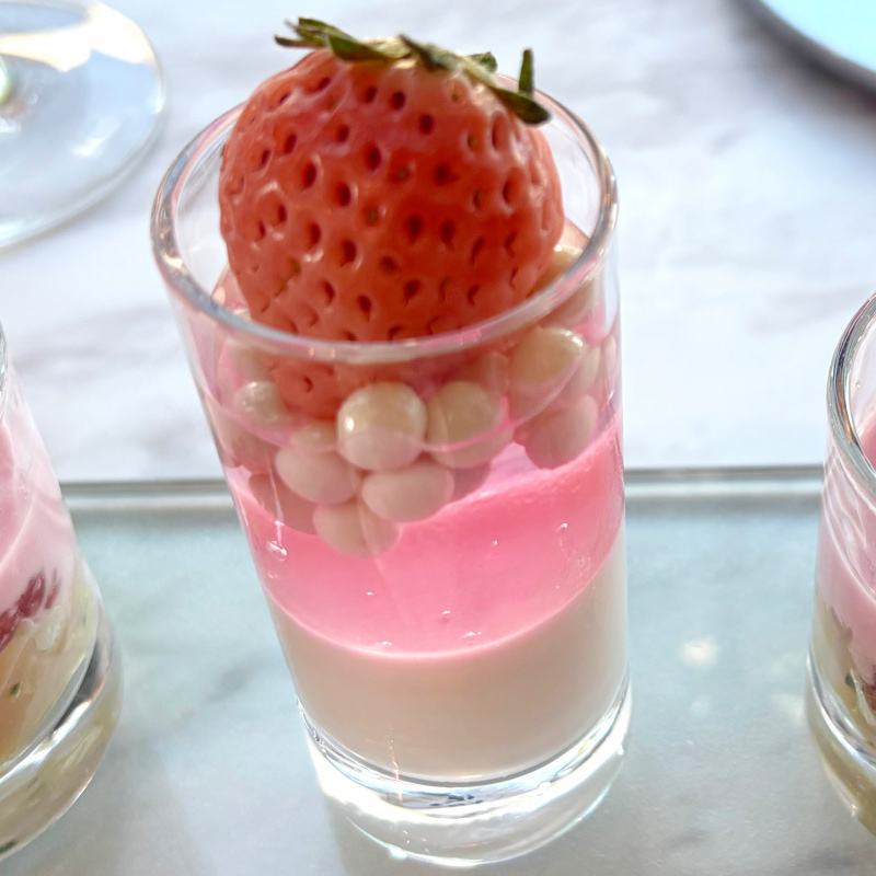 春らしさをぐっと引き上げるのが、「桜のヴェリーヌ」。真っ白なココナッツゼリーの上に桜ゼリーを重ね、パールと淡雪いちごで彩ったグラススイーツ。いちごの甘酸っぱさ、桜の香り、ココナッツのやさしい甘さが重なって春らしい味わい。見た目の透明感も美しく、ロンジンの〝エレガンス〟を色と質感で表現しているような一品です。華やかなのに、どこか静かな上品さがあるのが印象的。