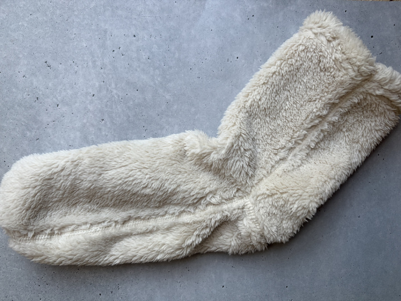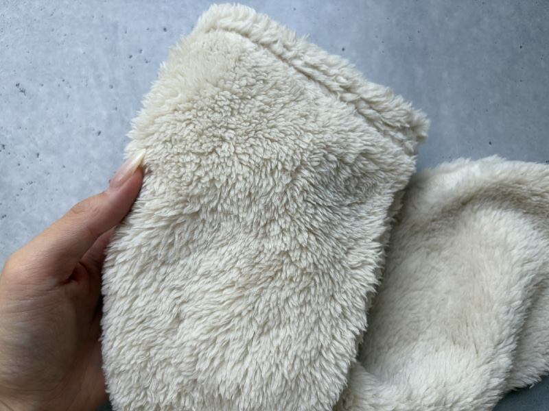 近くで見ると、ボアの毛足が短めで密度が高いのが分かります。ふわふわしすぎず、空気をしっかり含んでくれそうな質感。触ってもへたりにくそうで、あたたかさが長く続きそうな印象! 素足で触れてもチクチク感はなく、やさしい肌当たり◎。