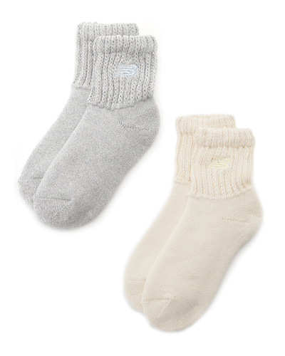 イエローとグレーの2足組ソックス。リラックス感漂うリブ使いが特徴で、ロゴがベースと同系色の刺繍で配されています。