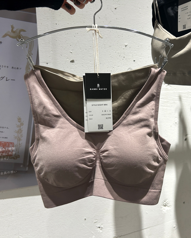 人気商品であるナイトブラも発見。私も毎晩使っています^^ 夜着けて朝そのまま出かけられる「一日中使える」スタイルナイトブラ。今までナイトブラは補正が強すぎて苦しいイメージがあったのですが、バンビウォーターのナイトブラは就寝中も快適な着け心地。きれいなバストを一日中キープしてくれますよ♡