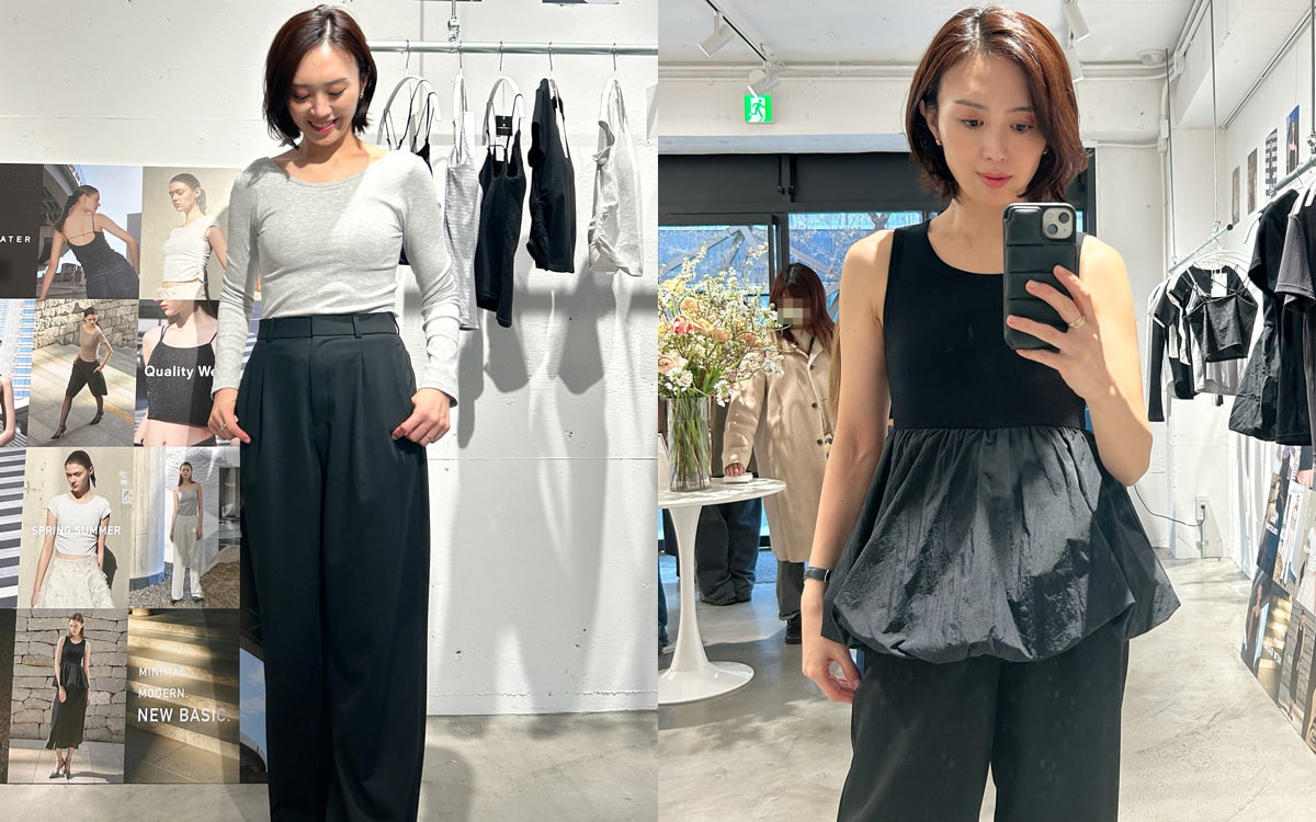 上下で素材を切り替えたドッキングデザインで、ボリュームのある裾バルーンがとってもかわいい♡ お腹やヒップをふんわりカバーしてくれるデザインも嬉しいポイント。一枚できれい見えを叶えてくれてストレスフリーな着心地が最高でした! プレスの方が黒のカーディガンを羽織って裾のボリュームを見せるコーデをしていて、そちらも素敵でした。一枚でもレイヤードでも映える一着。