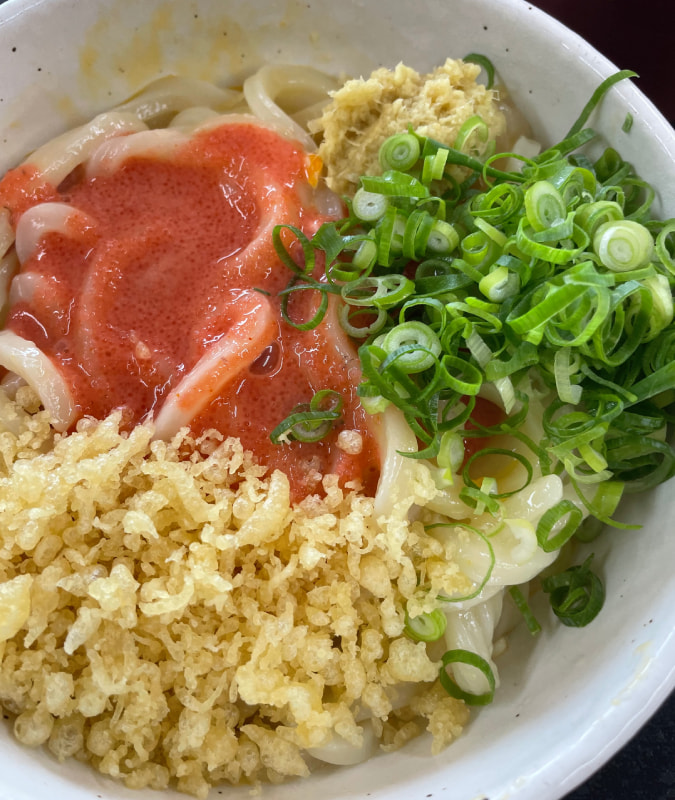 ▲明太釜玉うどんにフリーの揚げ玉とネギと生姜を大量トッピング。絶品です。