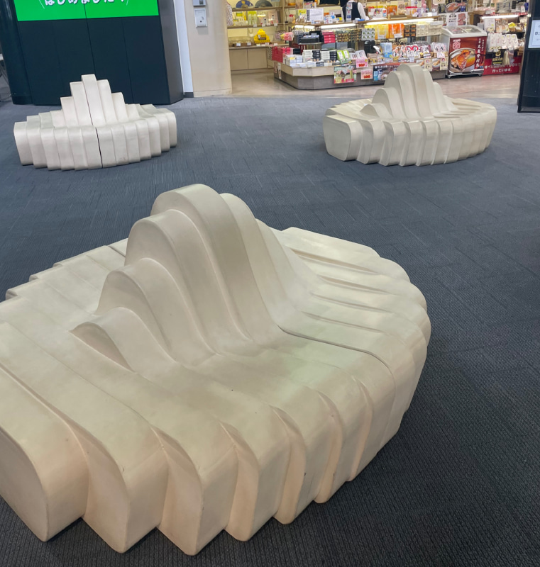 ▲高松空港はなんとソファがうどん! もちもちしていて座り心地抜群。うどん愛に満ちた空港です。