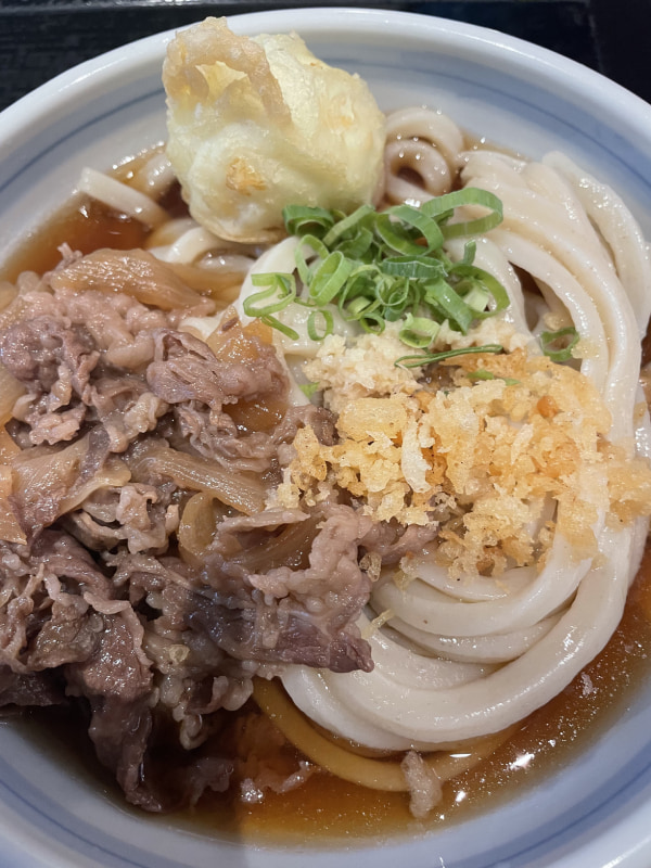 ▲高松港から高松空港に直行しても空港内で美味しいうどんを食べられるので安心して。肉うどんに揚卵をトッピングしたわんぱくな一杯。
