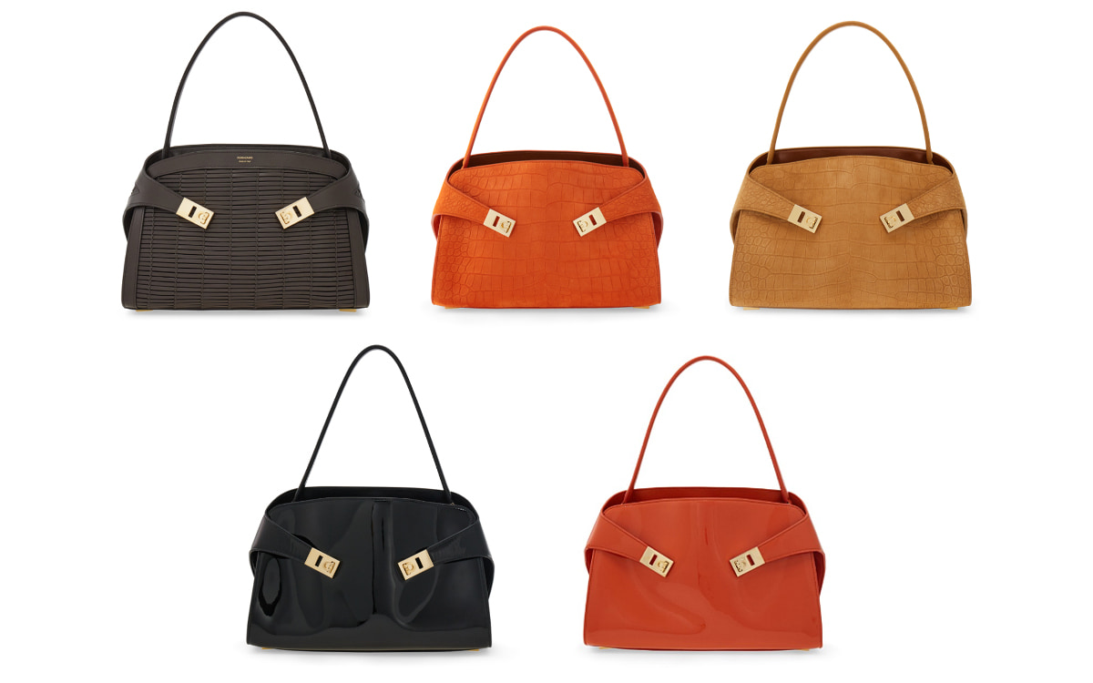 シグネチャーのガンチーニ・バックルを、バッグ抱きしめているようにあしらったデザインが特徴の「HUG」バッグ。今シーズンは、パテントレザーや編み込みレザー、型押しクロコ、ヌバックスエードといった多彩な素材、そして季節のカラーやプリントを纏ってお目見えします。