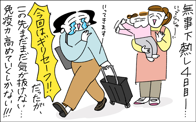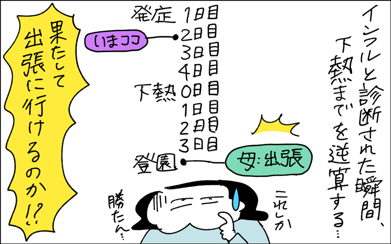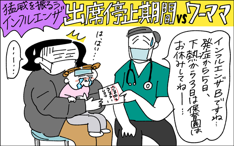 「インフルエンザAが落ち着いたのも束の間、インフルエンザBが猛威を振るっています。姉妹が一週おきに罹患していて絶望しています」と作者・カミナカケロヨンさん。仕事のスケジュールをどうする?が頭を過ぎる中。免疫力アップが目下の目標!