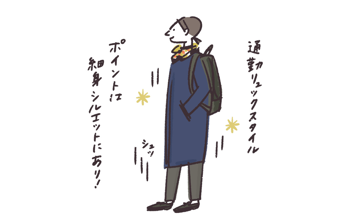 今となってはディテールまでは覚えていませんが、彼女は黒いリュックに細身のコートと九分丈パンツを合わせ、襟元にはスカーフ、足元にはローファーをON。見た瞬間にハッとして、その姿を脳内に焼きつけるようにしました。文字だけで説明すると、ごくベーシックな着こなしに思えるのですが、実はポイントは「細身なシルエット」にあると感じています。