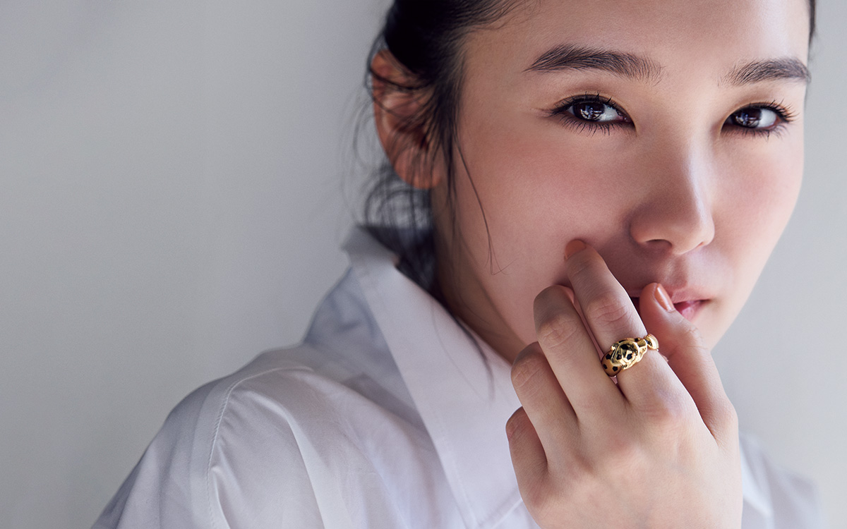 まりえといえば、シンプルで上質な白シャツ。ゆったりとしたフォルムが心地いい一枚に身を包んだら、手元には「パンテール ドゥ カルティエ」のリングを。揺るぎないエレガンスとモダンなパワーが宿る、アイコニックなジュエリーを味方につけて、新たなる一歩を軽やかに踏み出す。