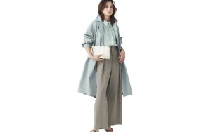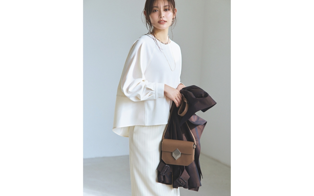 ブラウス¥9,900(ユナイテッドアローズ グリーンレーベル リラクシング ルミネ有楽町店〈グリーンレーベル リラクシング〉) スカート[共布ベルト付き]¥39,600・手に持ったコート[共布ベルト付き]¥90,200(DES PRÉS〈DES PRÉS〉) バッグ¥156,200(ピエール アルディ 東京〈ピエール アルディ〉) ピアス¥37,400(マリハ) ネックレス[短]¥39,600(フーブス〈quip queint〉) ネックレス[長]¥28,600(RHC ロンハーマン〈ボーニー〉)