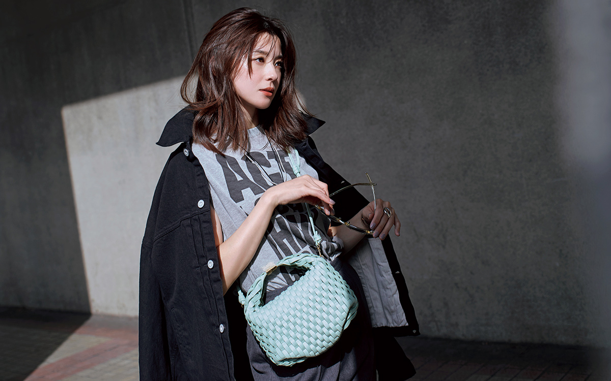 バッグ[17×21×10]¥97,000(ポレーヌ) 〝KURO〟のジャケット¥34,100・〝THIRD MAGAZINE×KATHARINE HAMNETT〟のカットソー¥15,400(THIRD MAGAZINE) パンツ¥18,700(カデュネ) サングラス¥101,200(アイヴァン PR〈10 アイヴァン〉) ネックレス[短]¥42,900(マリハ) ネックレス[長]¥23,100(ジャック・オブ・オール・トレーズ プレスルーム〈ブリー レオン〉) バングル¥59,400(The Edit Store〈アダワットトゥアレグ〉) リング¥24,200(フーブス〈IRIS47〉)