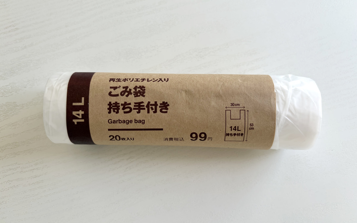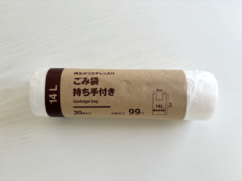 今回ご紹介するのは、無印良品の「再生ポリエチレン入りゴミ袋」。口コミでも評価が高く、ユーザー評価は4.6〜4.8とかなり人気のアイテムです。サイズ展開はさまざまですが、今回は使い勝手が良さそうな14L持ち手付きのものを購入してみたので、サイズ感や使いやすさ、袋の強さなどをチェックしてみました。