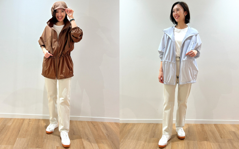 ほんのり透けるシアー素材が特徴の「UVカットシアーオーバーサイズパーカ」。オーバーサイズなので、羽織るだけで今っぽいコーデになる春のアウターだと思います。ブラウンと春らしいカラーのライトパープルを試着してみました。ウエストはドローコードで調整可能。ブラウンを着用した時はドローコードを絞ってみました。UVカット機能がついているので、通勤や休日の日焼け対策もできる1枚。小雨程度の水をはじく撥水加工なのも嬉しいポイント。自転車に乗る時にもおすすめです!