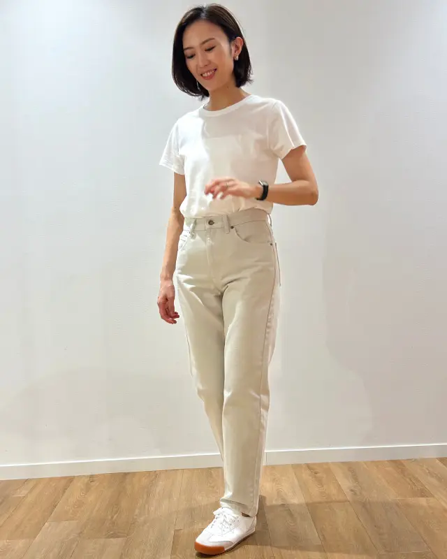 「ハイライズレギュラージーンズ」は、腰の位置が上がって見えるのでスタイルアップ効果も♡ 柔らかい色味のカラーがきれいめコーデのデニムにぴったりです。
