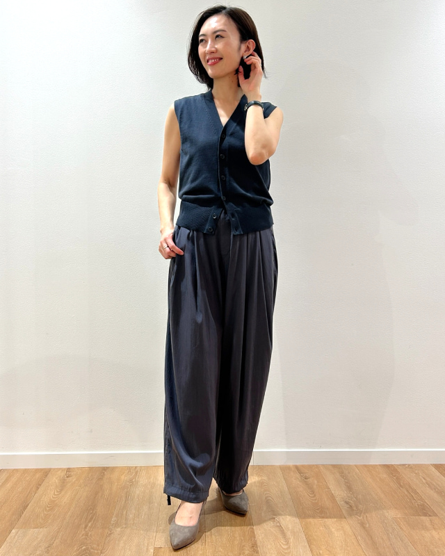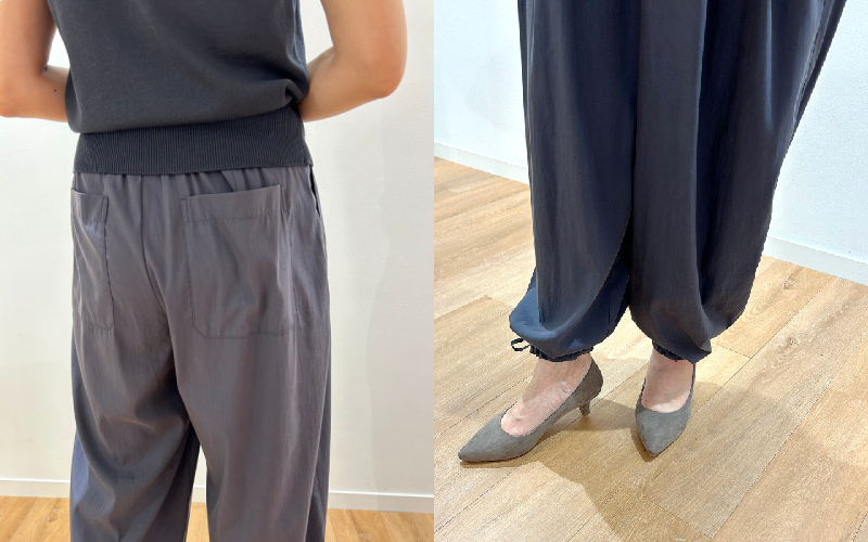 「イージーギャザーパンツ」は、空気を含む美しいドレープが特徴。軽くて脚がとってもきれいに見えるんです! ぜひ試着してみてほしいです^^ 通勤も休日も着用できる優秀アイテムだと思います♡
