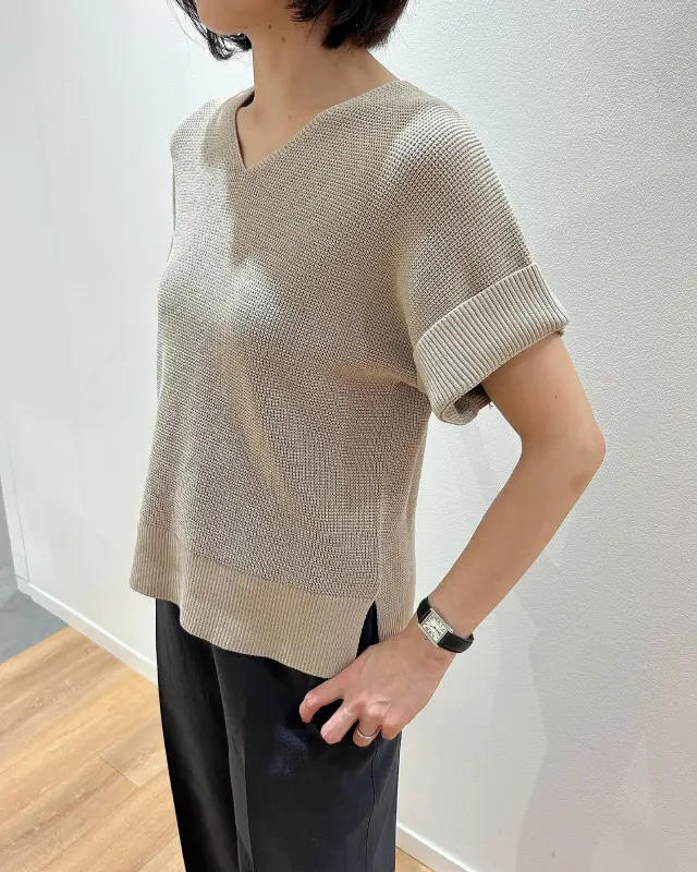 ゆったりとしたシルエットの「Vネックセーター」は、袖口を折るとまた違ったすっきりとした雰囲気に。ベージュ、ブラック、パープルの3色展開。忙しい朝に1枚でさらっと着られるので、落ち着いたベーシックカラーのニットは通勤コーデで助かるアイテム♡