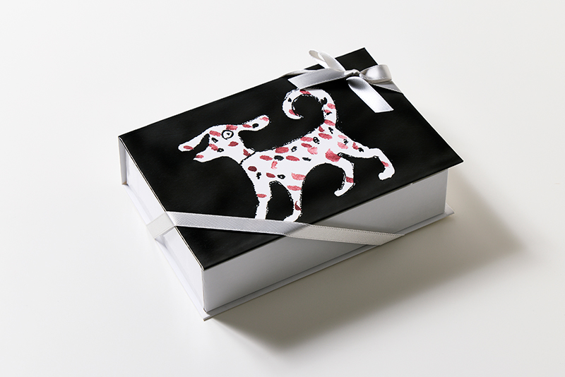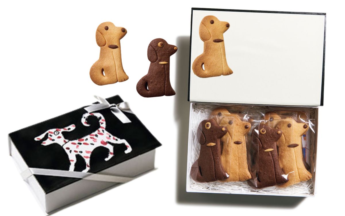 染色工芸作家・柚木沙弥郎さんの孫・丸山祐子さんの焼くクッキーは、犬のほか猫や乗り物モチーフもあり、ボックスのイラストも含めて柚木さんのオリジナルデザイン。