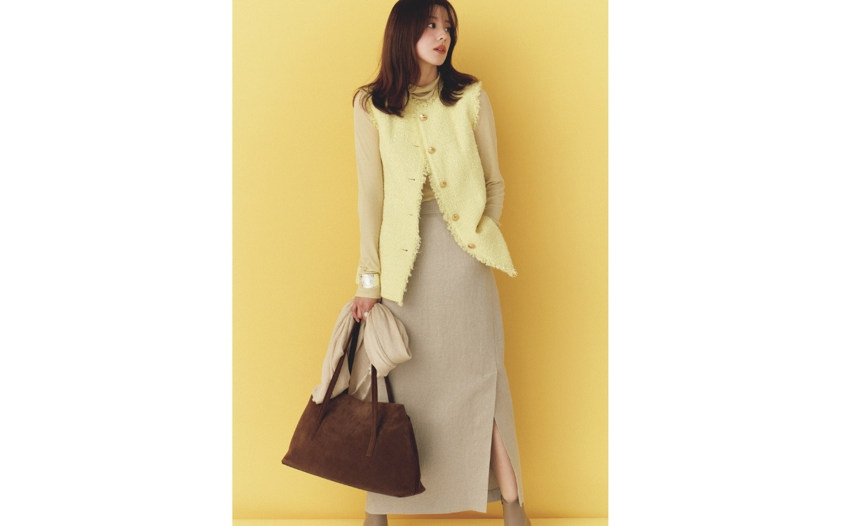 イエローの色味に加え、ペプラムシルエットやフリンジディテールで華やかなムードのツイードジレ。パサッと乾いたようなドライなスカートに合わせてテンションを大人っぽくクールダウン。