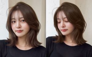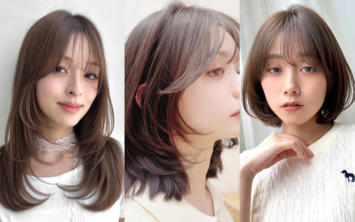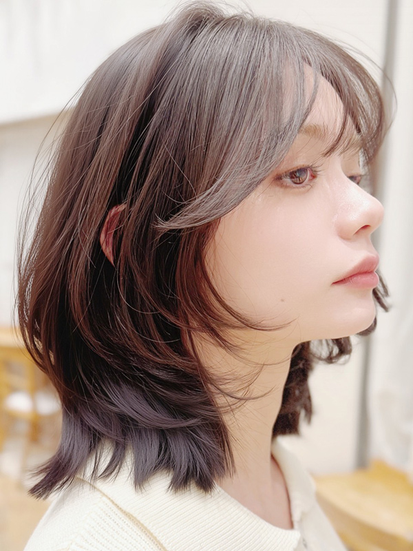 スタイルのベースは鎖骨上のワンレングスで、前髪あり・なしが楽しめるシースルーの2wayバングを合わせます。サイドバングは、頬骨が隠れる長さに設定。耳より前にしっかりレイヤーを入れ、トップからもハイレイヤーをプラス。