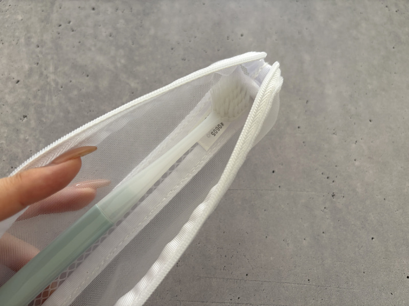 実際に歯ブラシを入れてみると中でカタカタ動きにくく、バッグの中でも安定して持ち運びやすい印象。外出先で歯磨きしたいときの歯ブラシポーチとして、ひとつ持っておくと便利だと思いました。