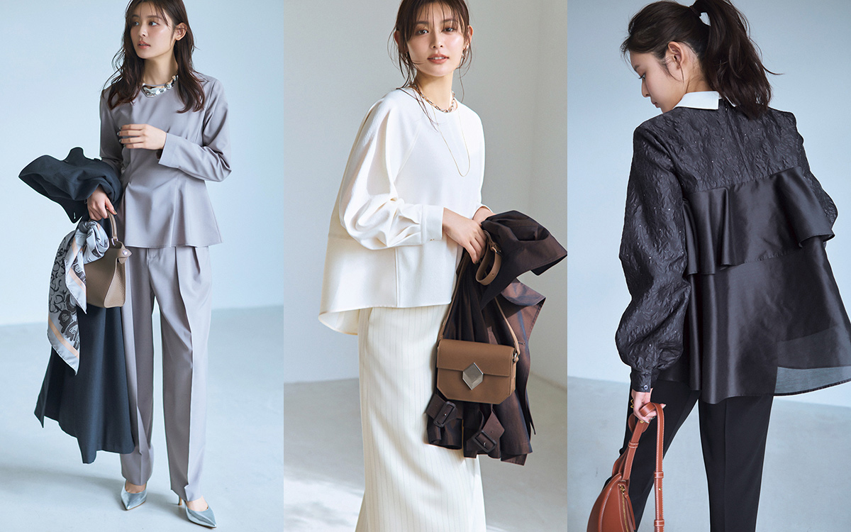 ウエスト高めの位置に絞りを入れたフォルムブラウスは、センタープレスパンツとのセットアップで、きちんと感がさらに上昇。スーツよりこなれて見えて、ワンピースよりもかっこいい、理想の〝素敵な先輩〟スタイルが楽々完成する。