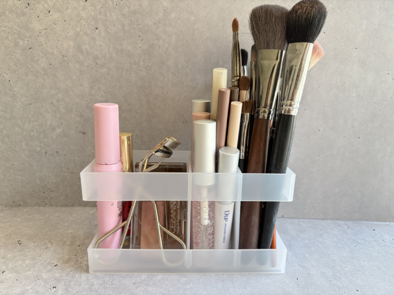 ペンブラシ用スタンドは、3つの区画に分かれる構造になっています。真ん中は少し狭く、両サイドは広めなので、ブラシやペンをサイズ別に分けて入れられます。細かいものも倒れにくく、取り出しやすいのがかなり便利。自然に整理されるので、引き出しの中が見違えるようにスッキリします。