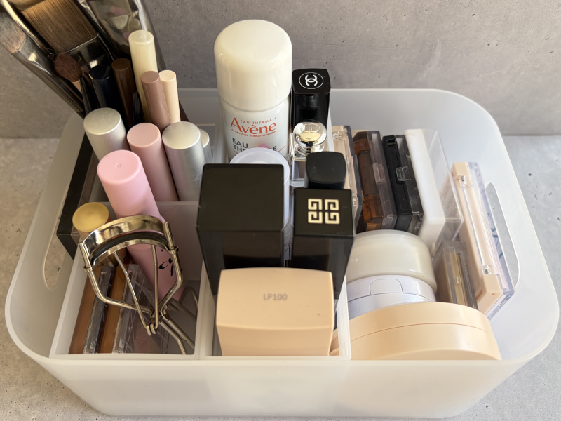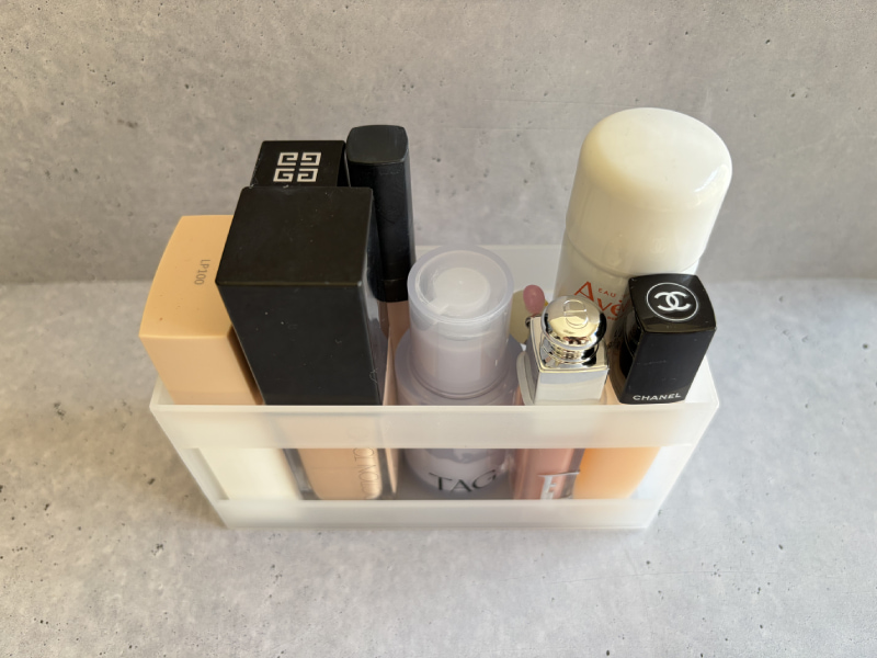 今回はベースメイクアイテムを入れてみました♡ 日焼け止め、ファンデーション、下地、コンシーラー、メイク時に使うミスト、余ったスペースにはリップ類をまとめて収納。普段は仕切りのないケースに立ててまとめていたので、倒れることがあったり無駄なスペースができたり、テトリスのように詰め込む必要がありました。でもスタンドを使うと、ストレスフリーで超スッキリ!