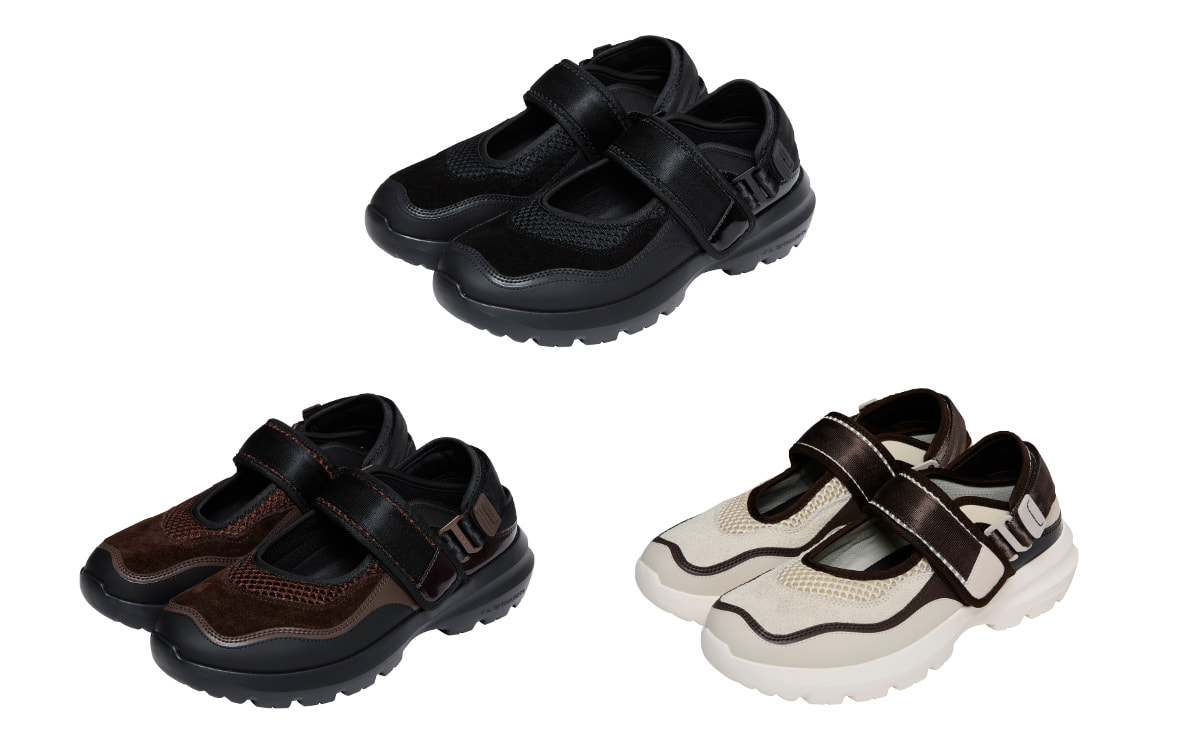 ヒールストラップを付けてワンストラップシューズのように、外してスライドサンダルとして、2wayで着用できる新作「グレートジャーニーEXR」。アッパーにメッシュ、ネオプレン、テープ、パテントレザーを組み合わせたレイヤードデザインが特徴です。