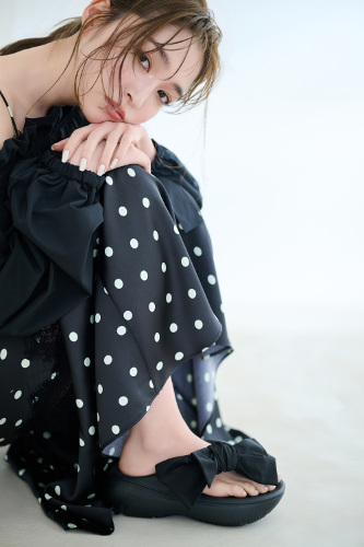 同色の大きめリボンが“大人可愛い”を叶える、履き心地の良さとデザイン性を兼ね備えた一足。春夏の足元を軽快に彩ります。