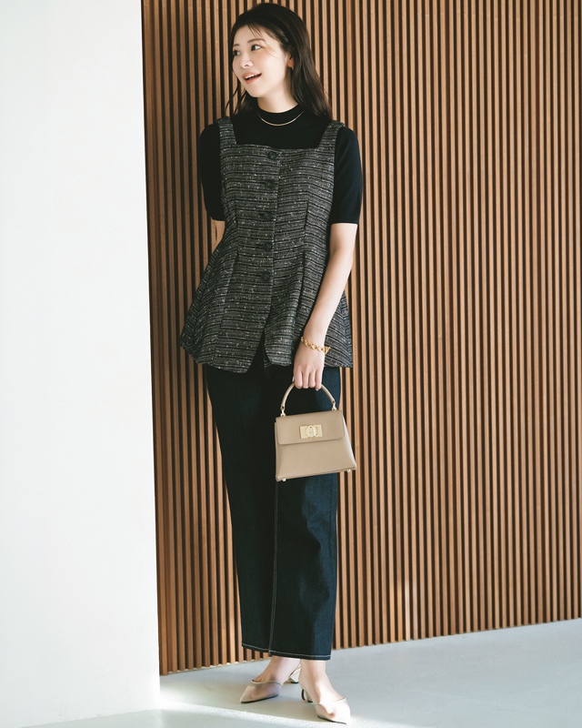 ジレ¥19,800(カデュネ) ニット¥19,800(ツル バイ マリコ オイカワ) デニムパンツ¥39,600(ファイブフォックス カスタマーサービス〈K.T キヨコ タカセ〉) バッグ¥71,500(フルラ ジャパン〈FURLA〉) 靴¥53,900(フィルム〈コルコバード〉) カチューシャ¥19,800(ACCA GINZASIX STORE〈ACCA〉) ピアス[片耳]¥63,800・ネックレス¥143,000(スタージュエリー表参道ヒルズ店〈スタージュエリー〉) ブレスレット¥3,850(サンポークリエイト〈アネモネ〉)