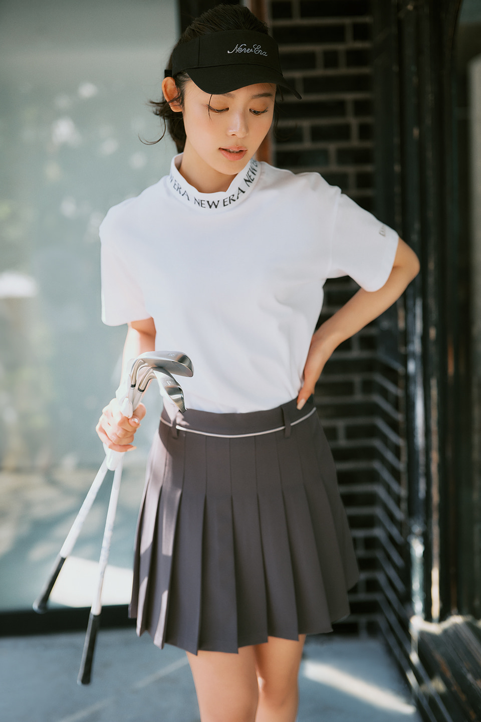 ゴルフの基本とも言える白トップスは、単調な印象にならないよう、ディテールにこだわるのが鉄則。襟元のジャガードロゴと首回りにゆとりを持たせたミッドネックTシャツなら、1枚でも抜群の存在感。ボリュームを抑えたプリーツスカートと合わせれば、品のあるスポーティスタイルが完成。仕上げはラインストーンつきサンバイザーで、さりげない華やかさをプラスして。