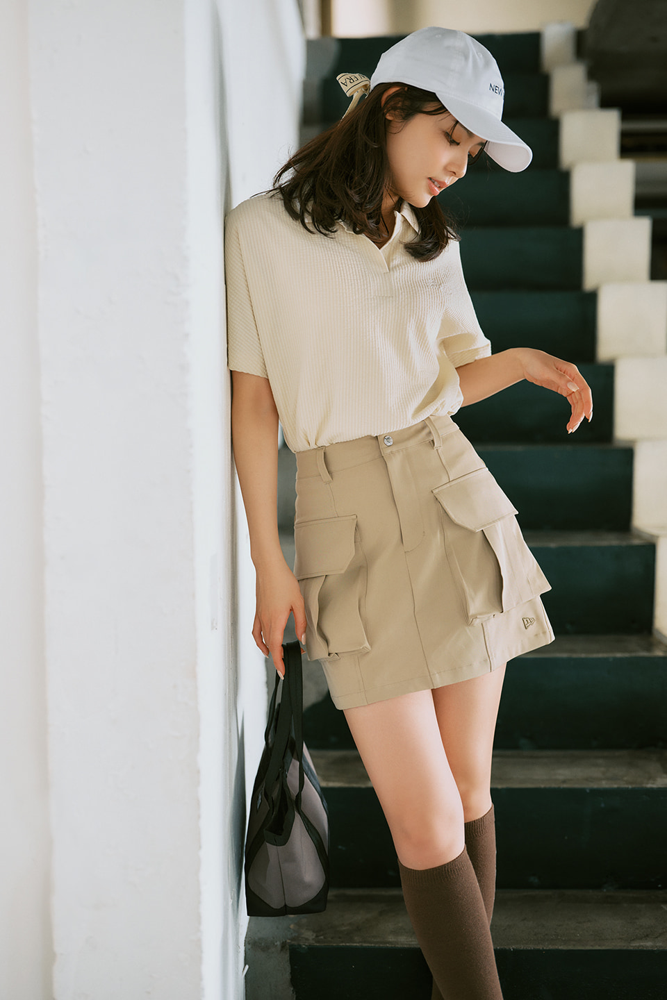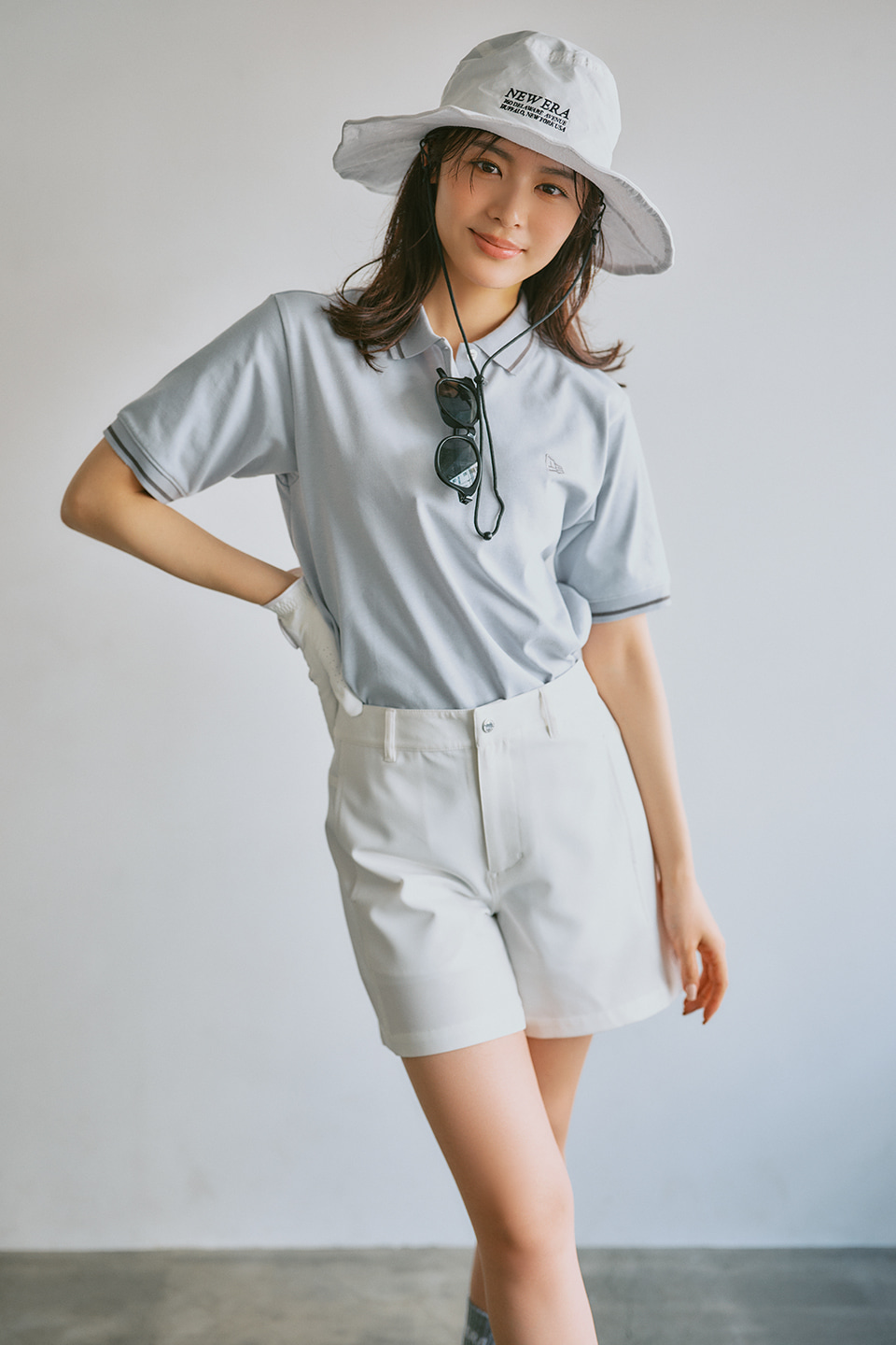 昨シーズンから人気のスキッパーポロの新色はベージュ。ドルマンスリーブから漂うリラクシーな雰囲気は残しながらも、あえてウエストインすることで“きれいめ”な印象をキープ。全体をベージュのワントーンでまとめつつ、仕上げはロゴテープ付きキャップのリボンで甘さを加えるのも忘れずに。合わせ小物ひとつで、いつものコーデがぐっと今っぽく見えるのもNEW ERA® GOLFの特徴。