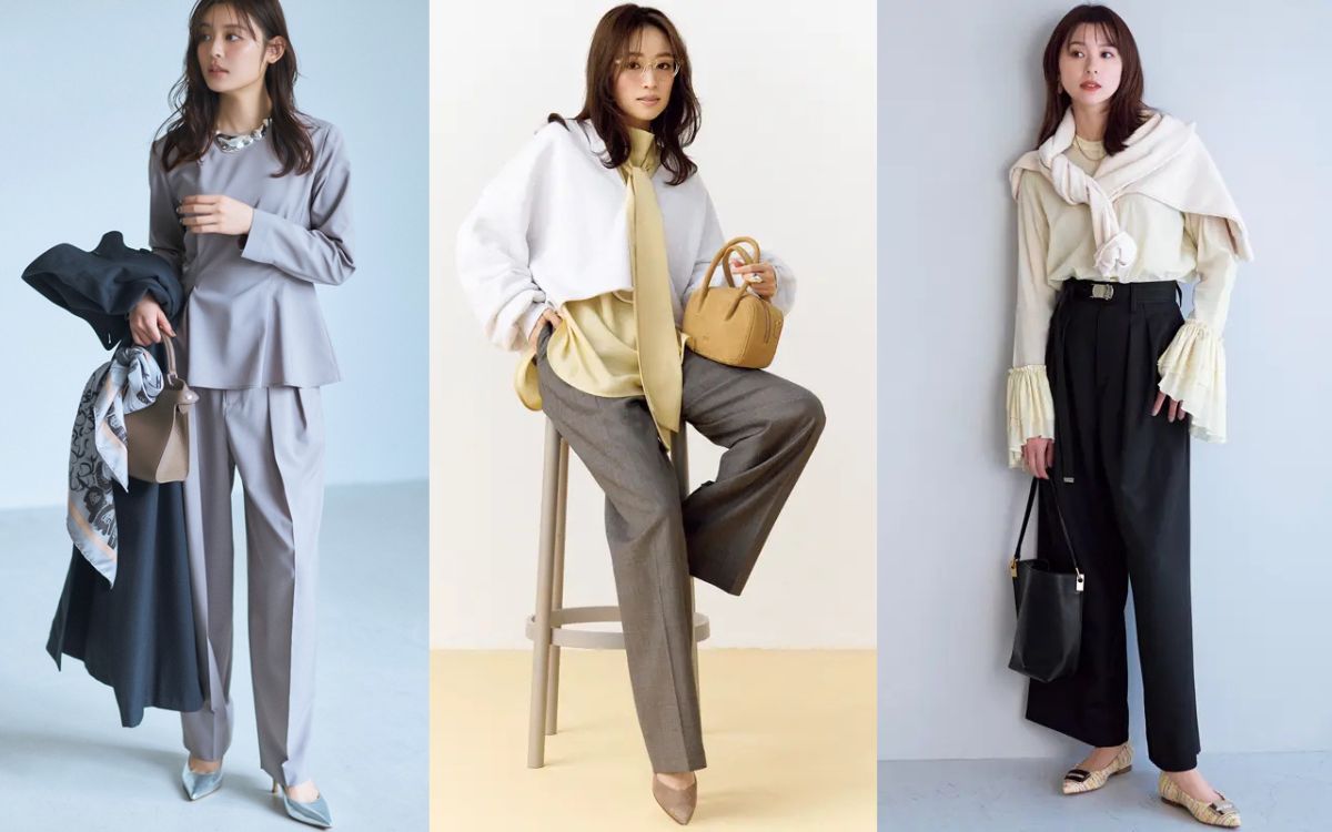 落ち感が美しいセンタープレスパンツを合わせると、ぐっと大人っぽさが増して。黒×ベージュ配色も、オフィスで好印象間違いなし。