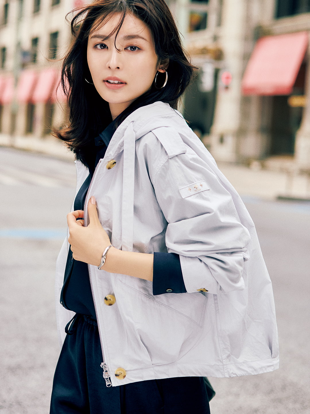 ブルゾン¥110,000(タトラス カスタマーセンター〈タトラス〉) シャツ¥33,000・パンツ¥30,800(ウィークエンド) イヤリング¥18,700(アビステ) バングル¥66,000(シープレス〈ミチ ウィルウェイ〉)