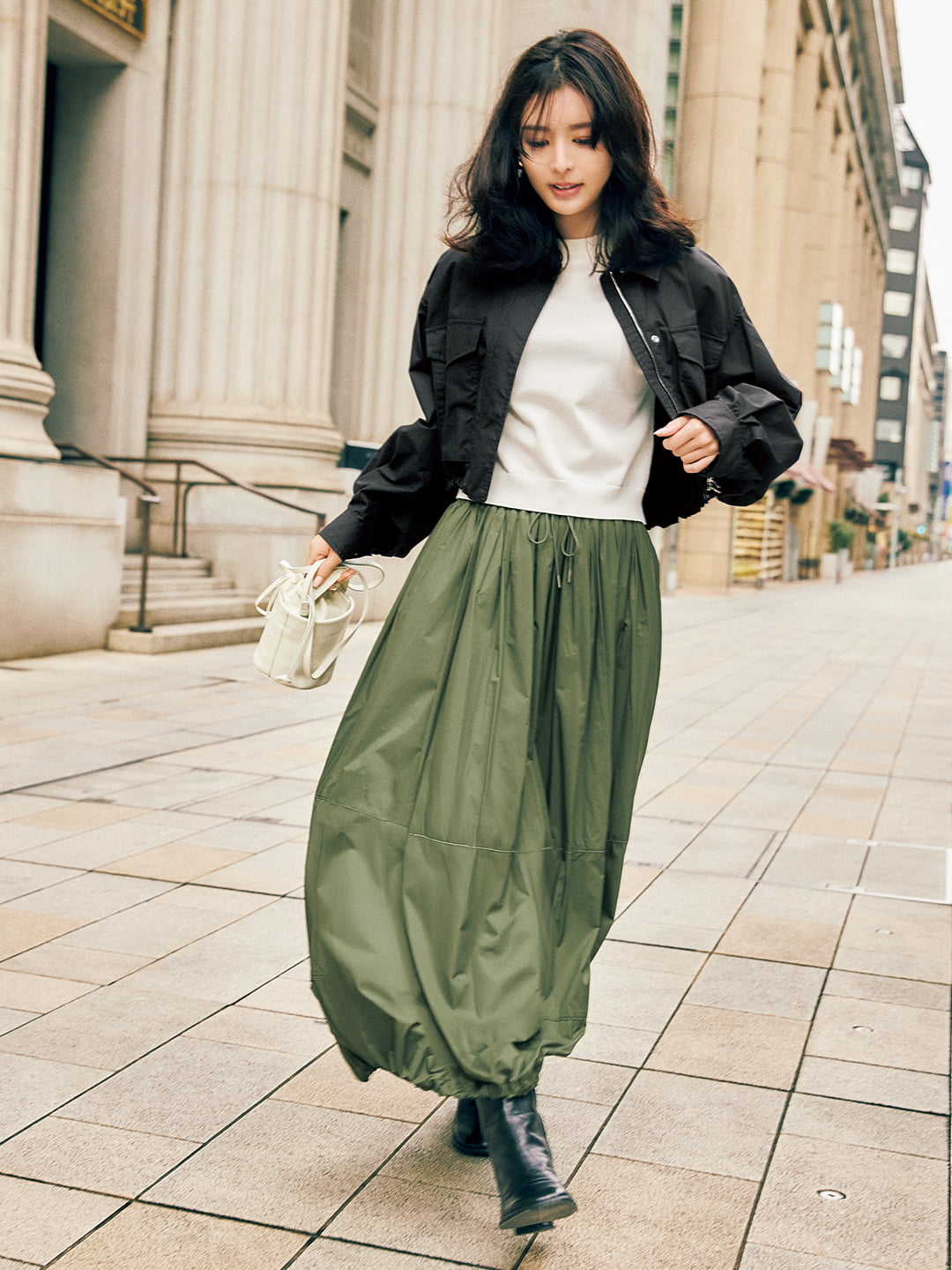 ブルゾン¥99,000・ニット¥33,000・スカート¥49,500(タトラス カスタマーセンター〈タトラス〉) バッグ¥44,000(ザハイライツ) 靴¥47,300(伊勢丹新宿本店 本館2階 婦人靴〈ファビオ ルスコーニ〉) イヤリング¥8,800(アビステ)