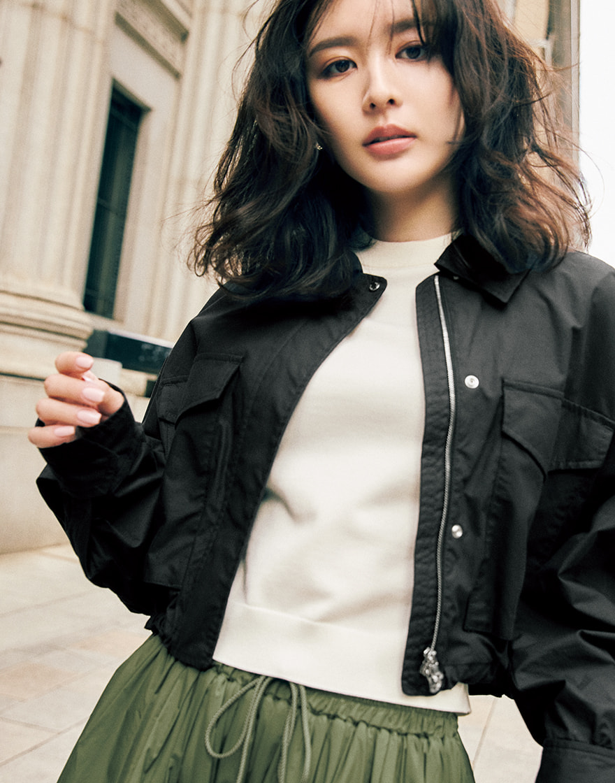 Aラインタイプのショートブルゾン〝ジュトゥルナ〟は、シャカシャカとした素材と相まって春らしいエアリー感をまとえる一枚。シンプルなとろみ素材のセットアップにはおることで、大人の余裕や迫力が加わり、きれいめスタイルがより一層印象的に。