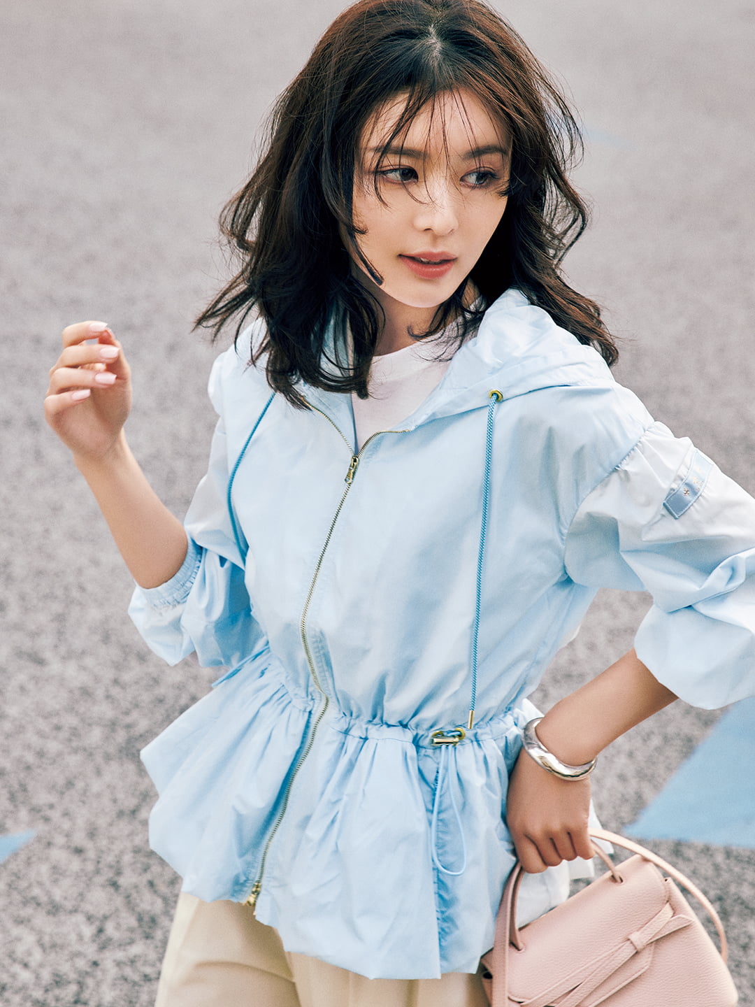 ウエストにドローコードが付いていて、シルエットのアレンジがしやすいミドル丈のフーディブルゾン〝タリア〟。絞ってフェミニンなラインをつくっても、甘くなりすぎないのはこのハリのあるナイロンの素材感あってこそ。ウエスト位置が少し高めに設定されているので、スタイルアップ効果も抜群。
