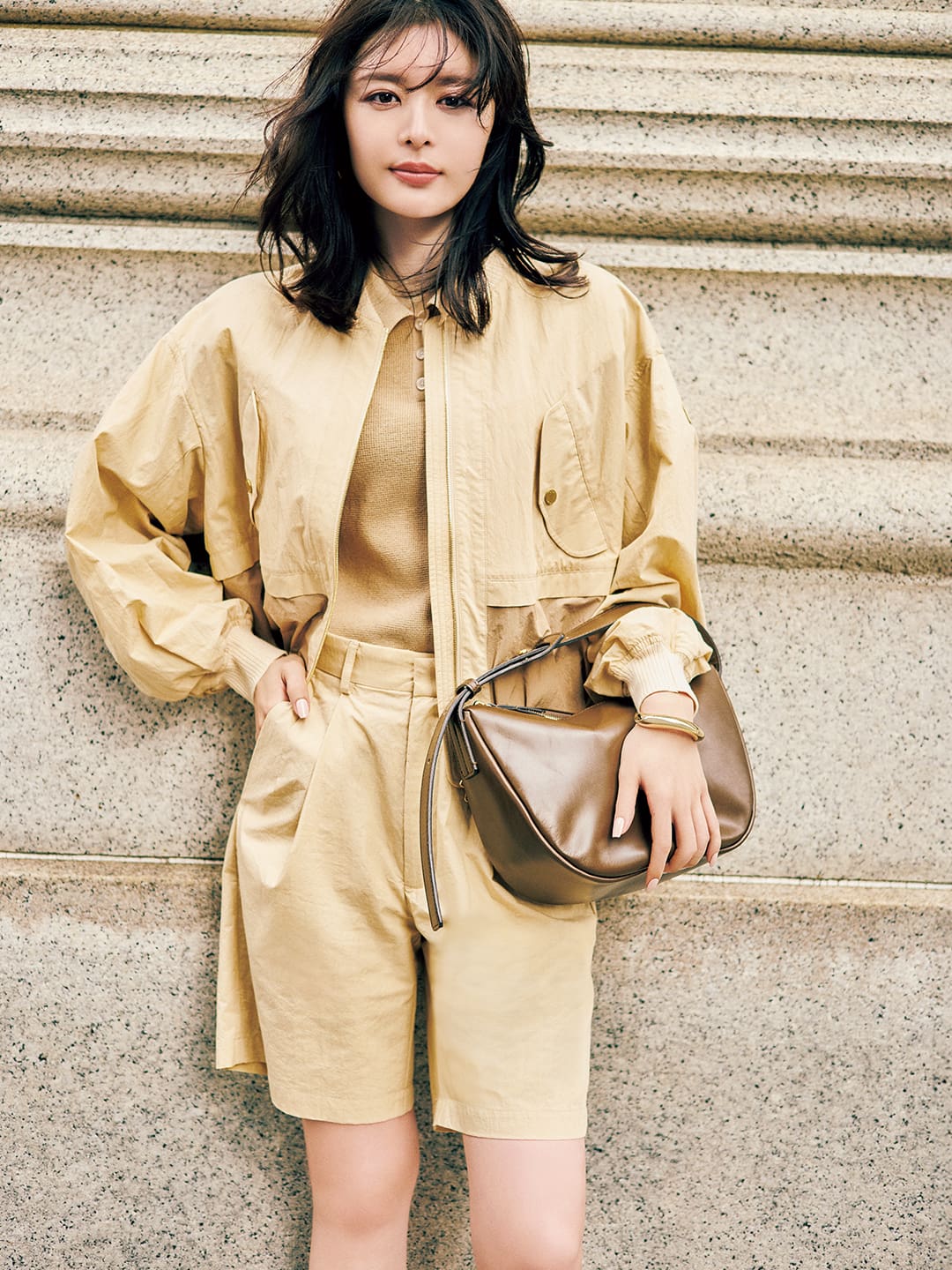 ブルゾン¥101,200・ニット¥37,400・パンツ¥41,800(タトラス カスタマーセンター〈タトラス〉) バッグ¥82,500(土屋鞄製造所〈土屋鞄〉) バングル¥13,750(フォーティーン ショールーム〈エイチアッシュ〉)