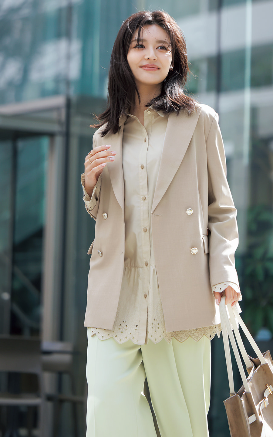 アイレットレースを生かしたレディなレイヤードは、色使いもやわらかくたおやかに。クールにまとめがちなジャケットスタイルだからこそ、ベージュを軸にしたニュアンスカラーのグラデーションが新鮮。ナチュラルだけど大人の余裕が漂う、半歩先ゆく着こなしが手に入る。