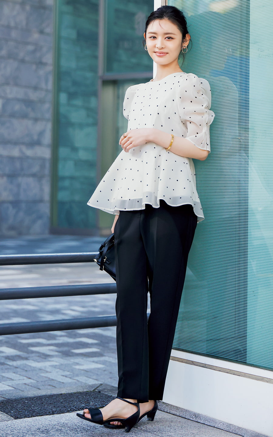 印象的な袖のくしゅっとギャザー、ひらりと透けながら揺れる裾… 着こなしをすっきりと引き締めてくれる黒の美脚パンツで、スイートなブラウスの魅力を満喫。小物も辛口な黒でまとめれば、シルエットにもテイストにもメリハリが。盛りすぎない〝引き算〟のおしゃれで、甘ブラウスをかっこよく楽しみたい。
