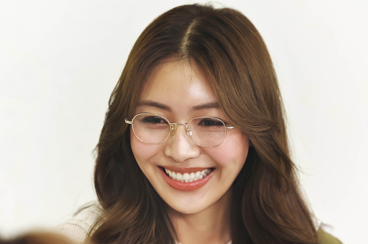 「自分には似合わないんじゃないかとメタルメガネはかけるのを諦めていた」という米倉さんですが、試着後はこのスマイル。肌なじみのいいゴールド系なら、トレンド感のあるメガネもより挑戦しやすい!