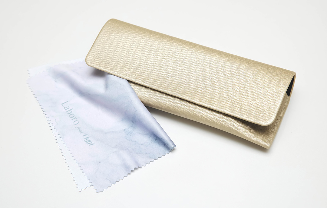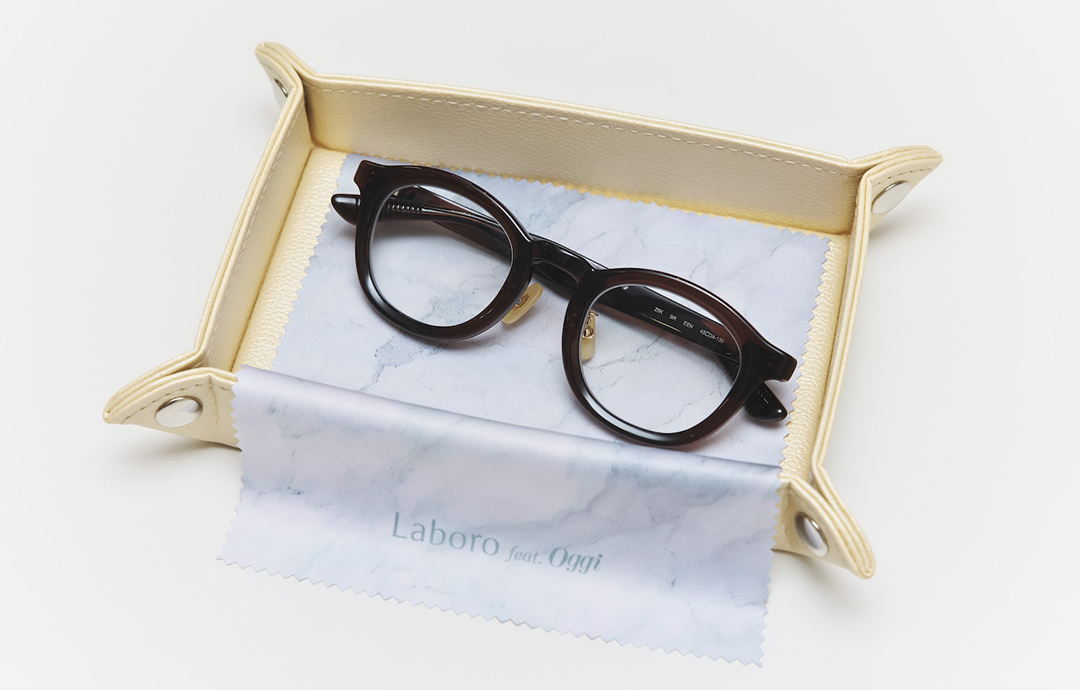また今回のコラボメガネは、メガネトレイとメガネ拭きもセットに。メガネって、外したときの置き場所が意外となかったりするもの。自宅やオフィスで使うのはもちろん、四隅のスナップを外せば平らになるので、旅先などに携帯するのも◎。メガネライフをより快適に満喫できます。