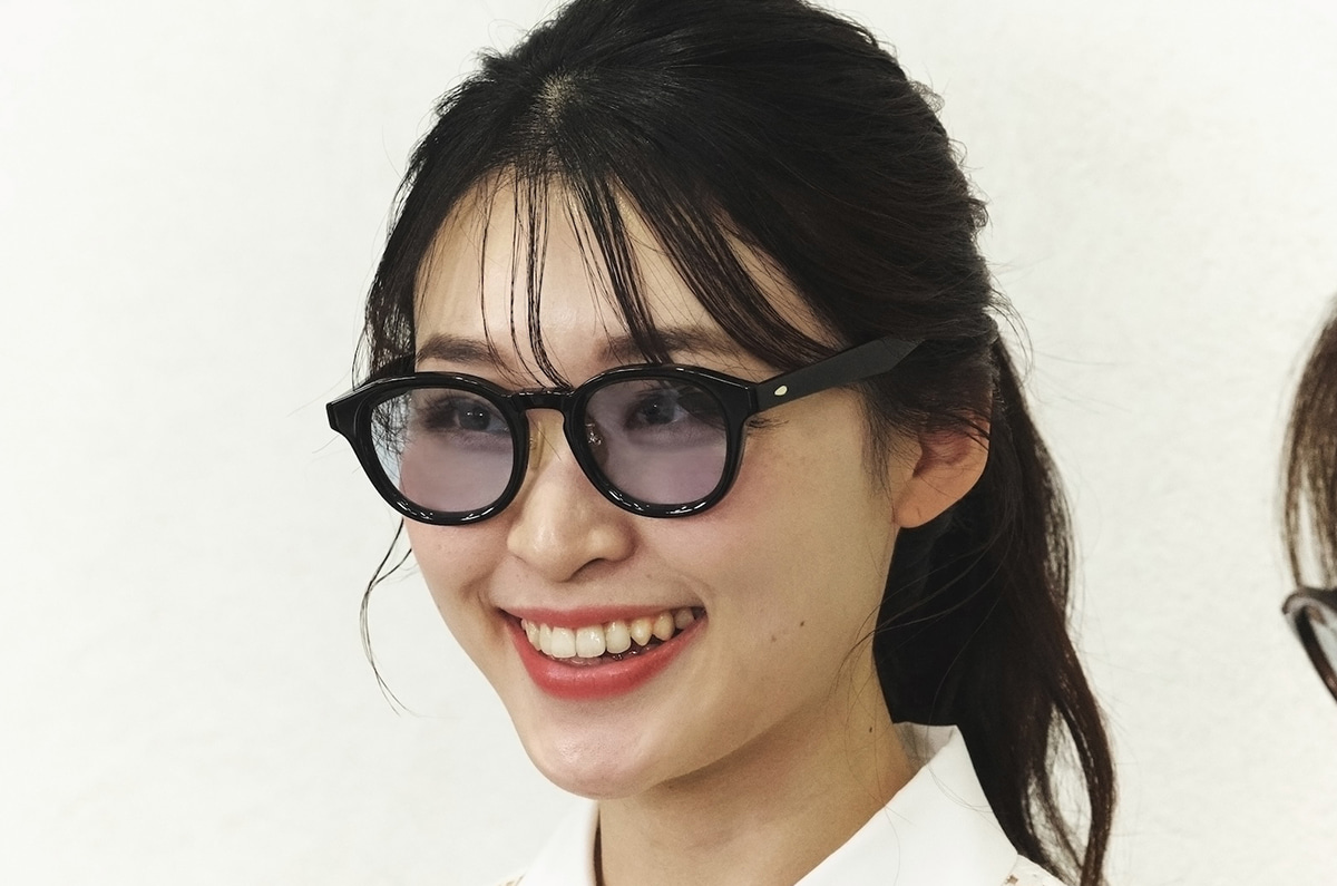 「会社にもかけていきやすいように、メガネ感覚でつけられるサングラスをつくりました」と長井さん。「通常のサングラスよりサイズを少し小さくして、メガネと同じような大きさに。目の輪郭が透けて見えるレンズカラーもポイントです」とデイリーに使えるこだわりを冨澤さんが解説してくれました。長井さんがかけているような暖色系のカラーレンズは、肌を血色よく見せてくれる効果も!