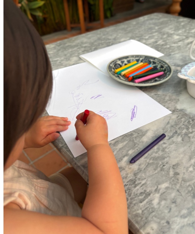席に案内されると、娘用にすかさずクレヨンと紙を用意してくださったおかげで、メニュー選びも集中できました(笑)。 蚊除けスプレーもさっと貸し出してくださり、蚊に刺されやすい夫や娘も安心。スタッフの方が目の前を通るたび、娘に手を振ってくれたり、声をかけてくれたり。