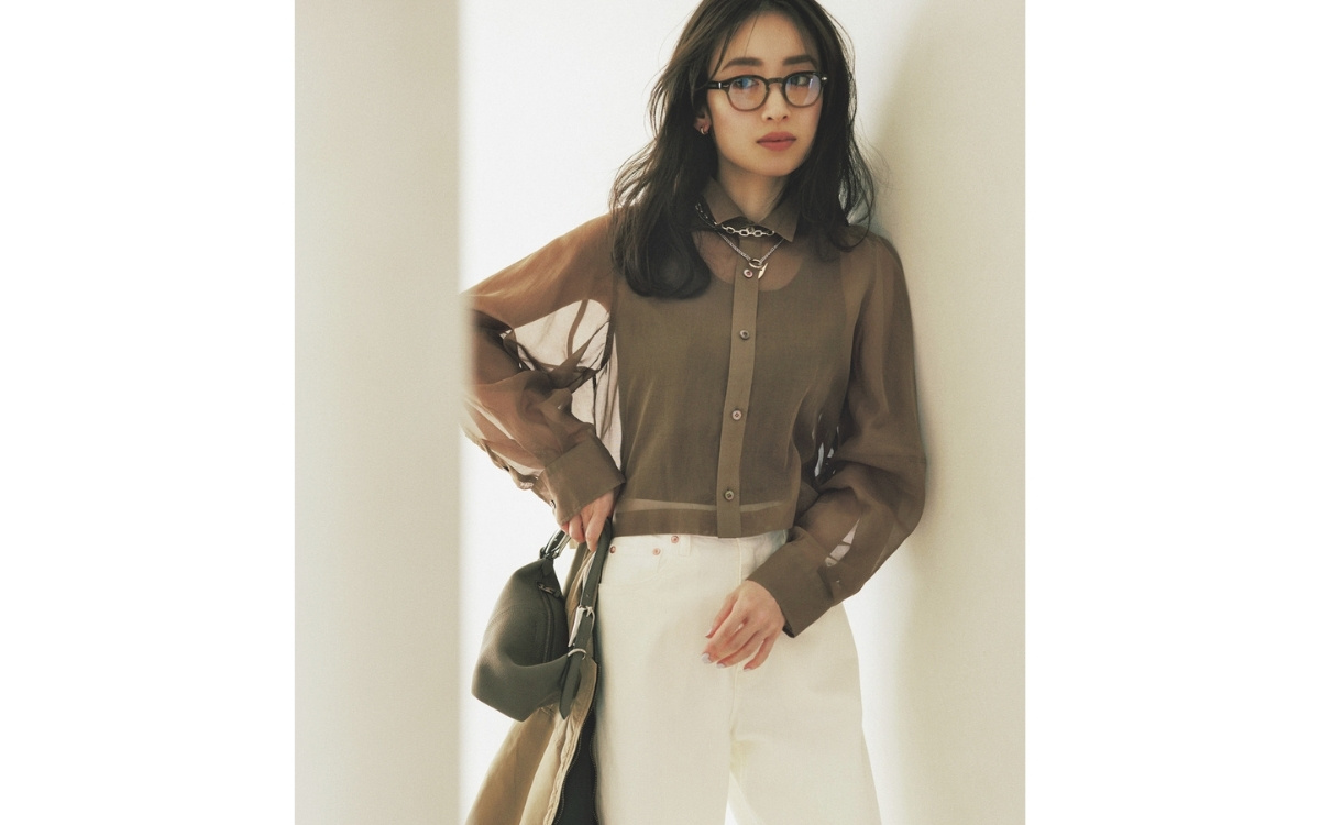 ダークベージュのシアーシャツは、短丈でバランスを更新。きれいめな魅力はそのままに、旬も取り入れられるのが嬉しいポイント。