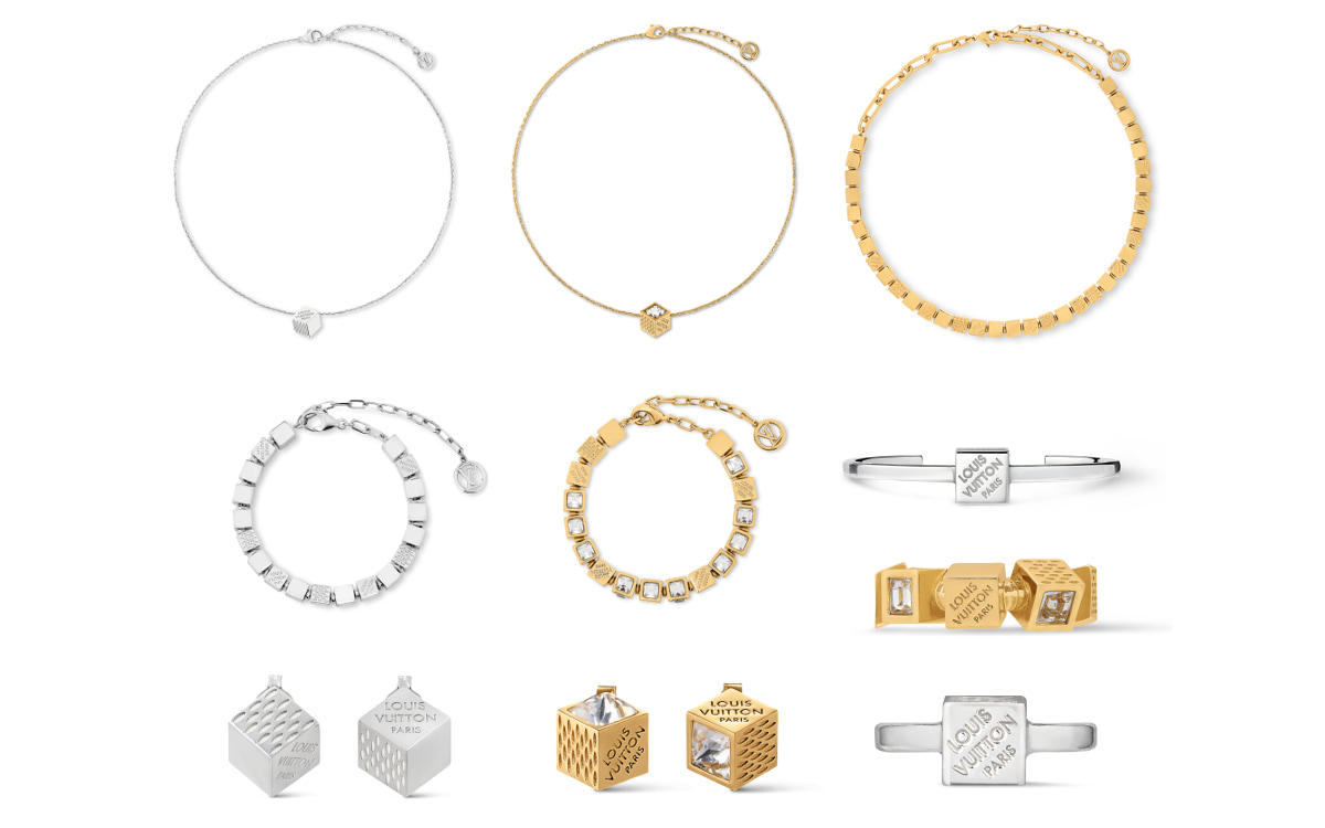 キューブを並べ、チェーンの先にLV サークルモチーフを付けたブレスレット。スターリングシルバーとメタルをラインナップし、メタルはラインストーンがあしらわれています。