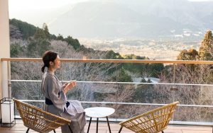 ”かわたれ時”と呼ばれる夜明け前の時間帯は、海と空の境界がゆっくりと明るくなっていく移ろいのとき。「界 出雲」には、そんな時を表現した言葉から名づけられた『かわたれテラス』があります。東の空と山に朝日が昇る瞬間を見つめることができる、絶好のロケーション。